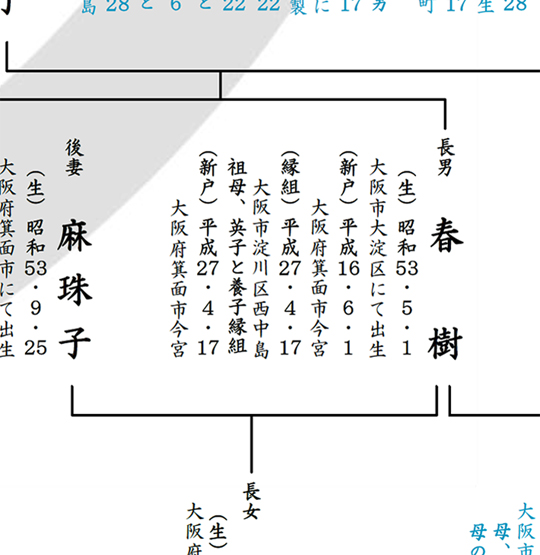 これら戸籍謄本から読み取ることのできるほとんどの情報を「正確に」「見やすく」一枚の家系図に表しております。