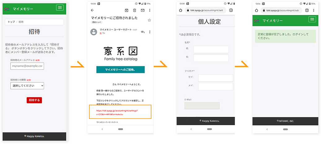 「マイメモリー」にはご親族招待機能があり、招待を受けたご親族はアカウントを作成すると
